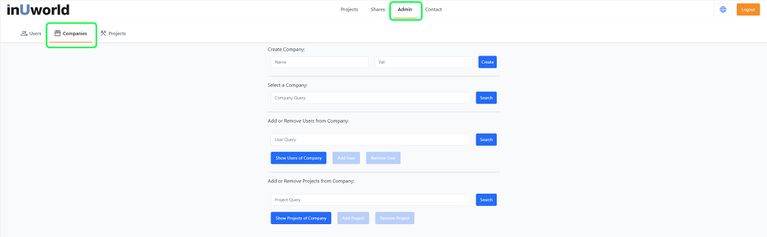Auf dem Benutzer Panel können Sie Benutzer zur Plattform einladen, Unternehmen erstellen und verwalten sowie Benutzer bestimmten Projekten hinzufügen.