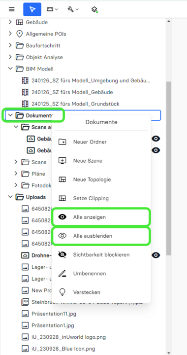 • Um alle Daten anzuzeigen oder auszublenden, klicken Sie mit der rechten Maustaste auf den Wurzelknoten des Ordners, um das Kontextmenü zu öffnen